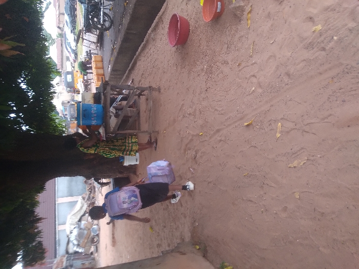 The image depicts an outdoor scene in Lafia, Nigeria, characterized by a reddish-brown sandy ground with scattered dry leaves, under the canopy of a large tree providing shade. In the foreground, a child, wearing a blue shirt, black shorts, and white sneakers, walks towards the right side of the frame, facing slightly away from the camera. They carry a purple backpack, featuring a cartoon character, on their back and a light purple duffel bag, which drags on the ground, in their left hand. A light-colored building wall is partially visible on the far left. In the mid-ground, beneath the tree, a woman stands facing a rudimentary wooden table. She is dressed in a patterned garment with green, yellow, and reddish hues, and dark flip-flops. On the table are a blue plastic cooler with a white lid and a transparent container. A white bucket rests on the ground near her feet. To the right of the table, two plastic bowls, one red and one orange-brown, are present on the sand. The background reveals a concrete gutter running parallel to a road. Beyond the gutter, a series of yellow jerry cans are arranged on the ground, and a person is observed bending over in proximity to them. A motorcycle is parked on the immediate right, next to the gutter. Further into the background, a street lined with parked vehicles, including multiple cars and a yellow auto-rickshaw (Keke Napep), is visible. Structures with light-colored walls and reddish roofs are discernible in the distance. To the far left background, a collection of discarded metal objects and large containers is accumulated against a wall.