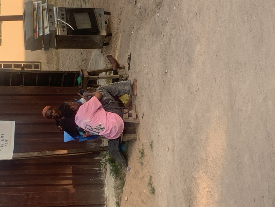 This image depicts an outdoor scene in Zango-ndaji, Nigeria, featuring two individuals and various objects on an unpaved, reddish-brown dirt ground. In the center-left, an older woman with an orange headwrap and dark clothing sits on a blue plastic chair, facing left and slightly away from the camera. Her hands are raised, appearing to interact with the dark, braided hair of a younger individual seated in front of her. This younger person, seen from the back, wears a pink t-shirt with a light-colored graphic (possibly "ROCK" and a star) and dark, faded jeans. They are barefoot, sitting on a wooden stool, with one black flip-flop lying on the ground near their right foot. Their posture suggests they are looking down, possibly at an object in their lap or on the ground. A smaller wooden stool with a green object rests to the right of the person in pink. Behind the seated individuals, a dark brown corrugated metal or wooden panel wall serves as a backdrop. A white sign with the partial text "AVAILABLE NOW" is affixed to this wall. To the far right, a large, dark grey outdoor gas range with an oven is visible, featuring "RESTAURANT" text on its lower door. Several smaller, lighter-colored metal objects are stacked on top of this unit. The ground is uneven dirt with sparse patches of green vegetation. In the background, a light-colored building with a dark window is partially visible.