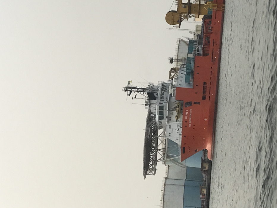 The image displays a large, orange vessel labeled "UT 745 E HD INTERVENTION" docked near the water