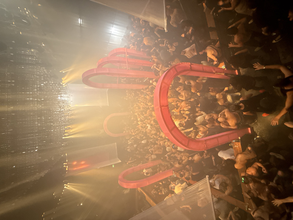 A densely packed crowd fills a large space, likely a club or concert venue. Three pink, rounded structures, possibly architectural features or art installations, rise above the crowd. A stage with lighting is visible on the left. Fog or smoke permeates the scene, obscuring details and enhancing the atmosphere. Many individuals in the crowd appear shirtless. The image is taken from an elevated perspective.