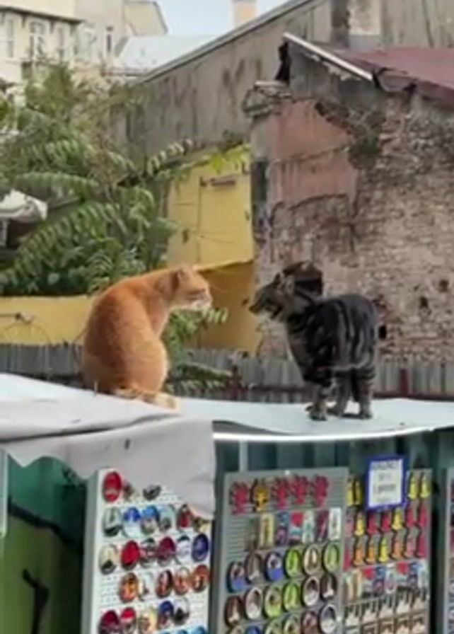 two cats, one orange and the other a dark tabby, facing each other on a rooftop. The orange cat is sitting, while the tabby cat is standing. The tabby cat is meowing. Below them is a vendor's display of magnets and other souvenirs. Buildings are visible in the background, and the sky is overcast.