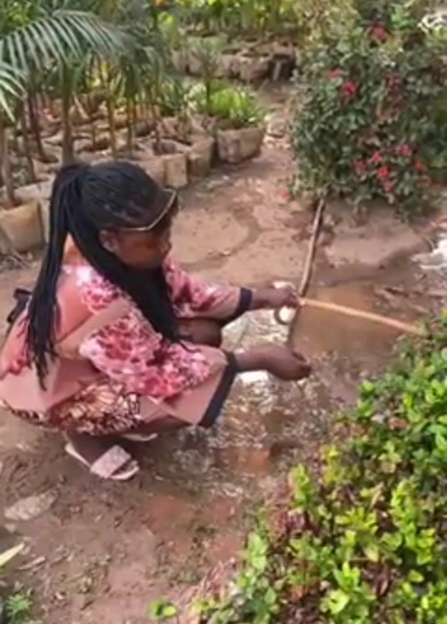 A woman with dark hair in a ponytail and sunglasses is crouched next to a puddle. She is wearing a floral print dress and sandals. She is using a stick to draw in the puddle. The ground is dirt and mud. There is lush greenery around the woman including a bush next to her. In the background are more plants, some in pots.