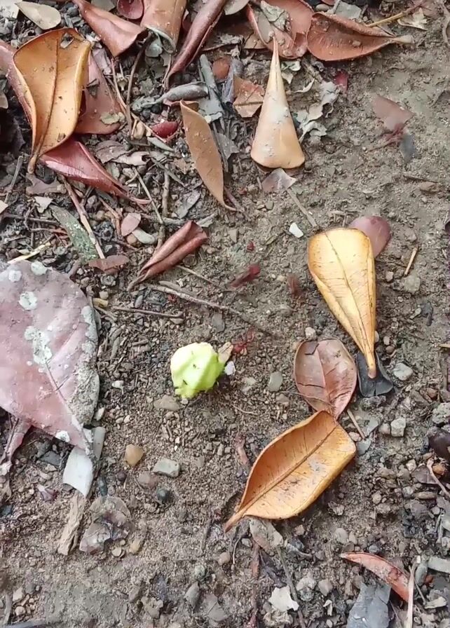 The video depicts a patch of ground covered in brown, dead leaves, small rocks, and dry twigs. A small, pale green object sits amidst the debris.
