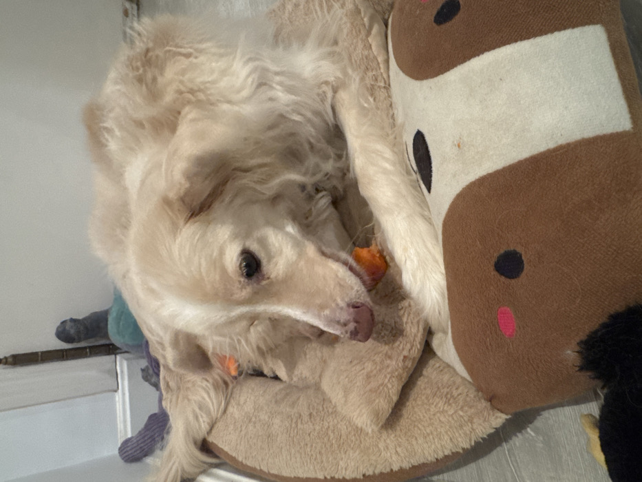 A light-colored, long-haired dog is curled in a tan, fluffy bed, next to a brown and white cow-patterned stuffed toy. The dog is holding an orange treat in its mouth and has a dark eye visible. A blue and purple toy also rests in the bed. The background includes a white wall and a corner of a door frame.