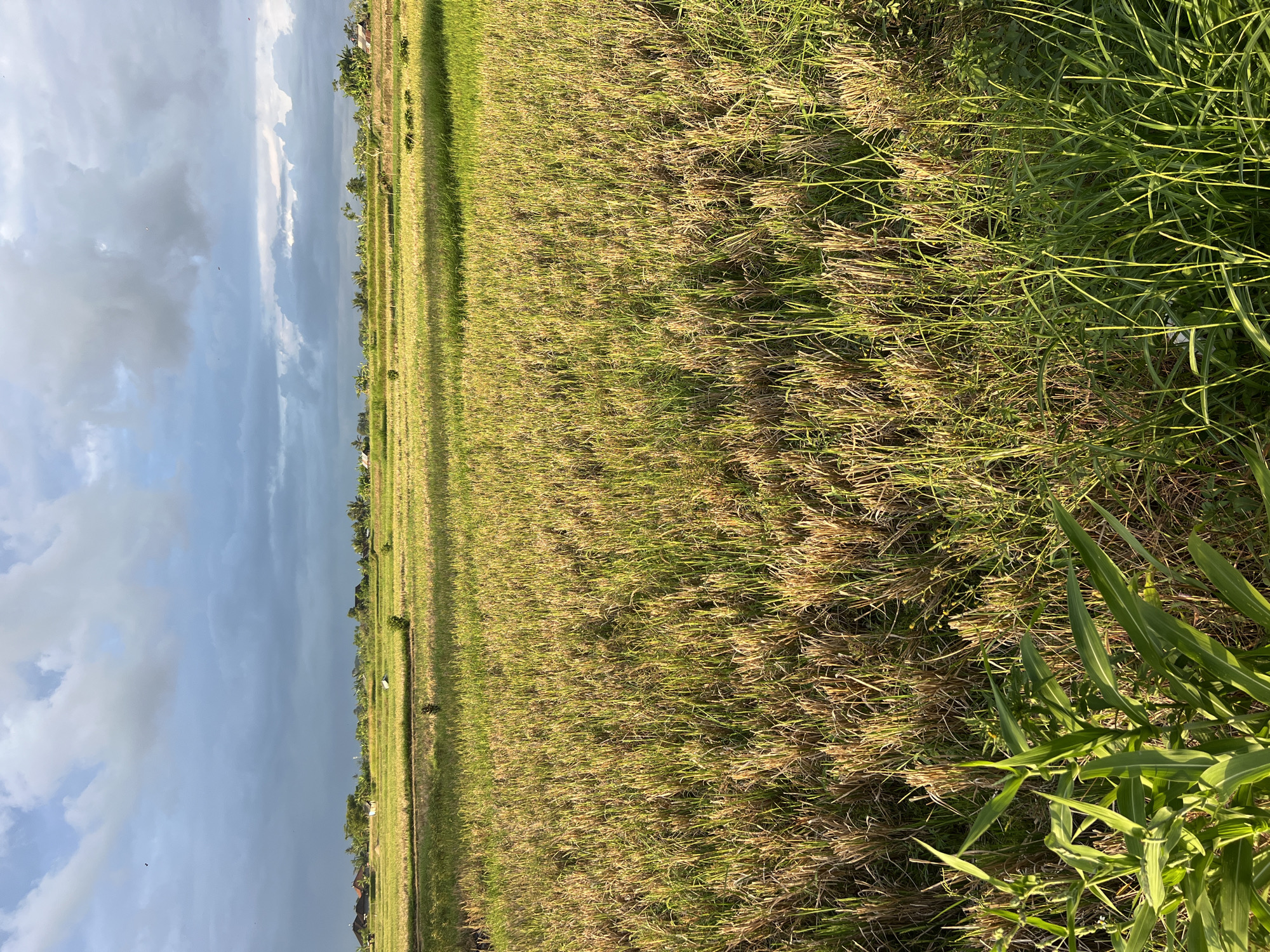 landscape in Abiansemal, Indonesia. It features a rice paddy field with golden-yellow and green stalks of rice. A patch of tall, green grass grows on the right side. In the distance, trees and buildings can be seen along the horizon. The sky is cloudy, with a mix of blue and grey clouds.