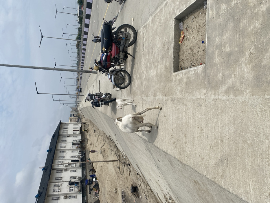 This image depicts a developing urban environment in Alaguntan, Nigeria, under an overcast sky. In the foreground, a large, lean white goat with visible udders walks away from the viewer on a concrete pathway, followed by a smaller, younger white goat. To their right, two motorcycles are parked upright on the pathway: a predominantly red and silver model with a black, worn seat, and a darker motorcycle further down. A square, recessed section in the concrete path in the bottom right contains sand and discarded items, including a plastic wrapper and a blue bottle cap. The concrete pathway runs parallel to a multi-lane asphalt road that recedes into the distance. Numerous tall, dark-colored streetlights with modern fixtures line both sides of the road. In the midground, a white car and a darker vehicle are visible driving on the road. A person is seen walking on the far side of the road, and another figure is near the road's edge further back. Black and white striped barriers or curbs are visible separating road sections in the distance. To the left of the concrete pathway, a significant construction or development area is visible. This area features large piles of light-colored sand, with several individuals engaged in various activities. One person stands in the sand in the mid-left, while a cluster of people appears further back, some possibly sitting or working near makeshift shelters or tarpaulins. A white, multi-story building with dark roofs and multiple windows, featuring external air conditioning units, extends along the background on the left. A wooden pole stands vertically within the sandy area. The overall scene suggests ongoing infrastructure and residential expansion.