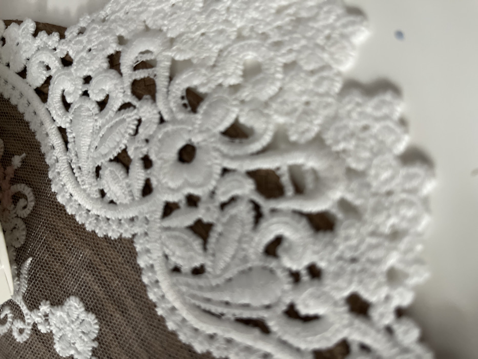 The image displays a close-up, top-down view of white embroidered lace with intricate floral and leaf patterns
