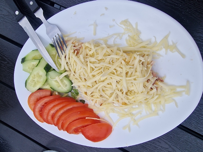 The image depicts a white oval plate, viewed from above, resting on a dark, slatted table surface in the city of Bicaz, Romania. The plate holds a meal consisting of several food items. On the left side, approximately nine uniformly sliced red tomatoes are arranged. In the upper central area, five to six slices of green cucumber are visible. The majority of the plate's surface, particularly the lower and central portions, is covered with a substantial quantity of light yellow shredded cheese, beneath which an underlying, partially obscured food item (likely a main dish) can be seen. A silver serrated knife with a black handle and a silver four-tine fork with a black handle are positioned diagonally across the upper right section of the plate, resting on the cucumber and shredded cheese. The dark, textured table surface, possibly wood or composite material, extends around the plate, suggesting an outdoor or patio setting.