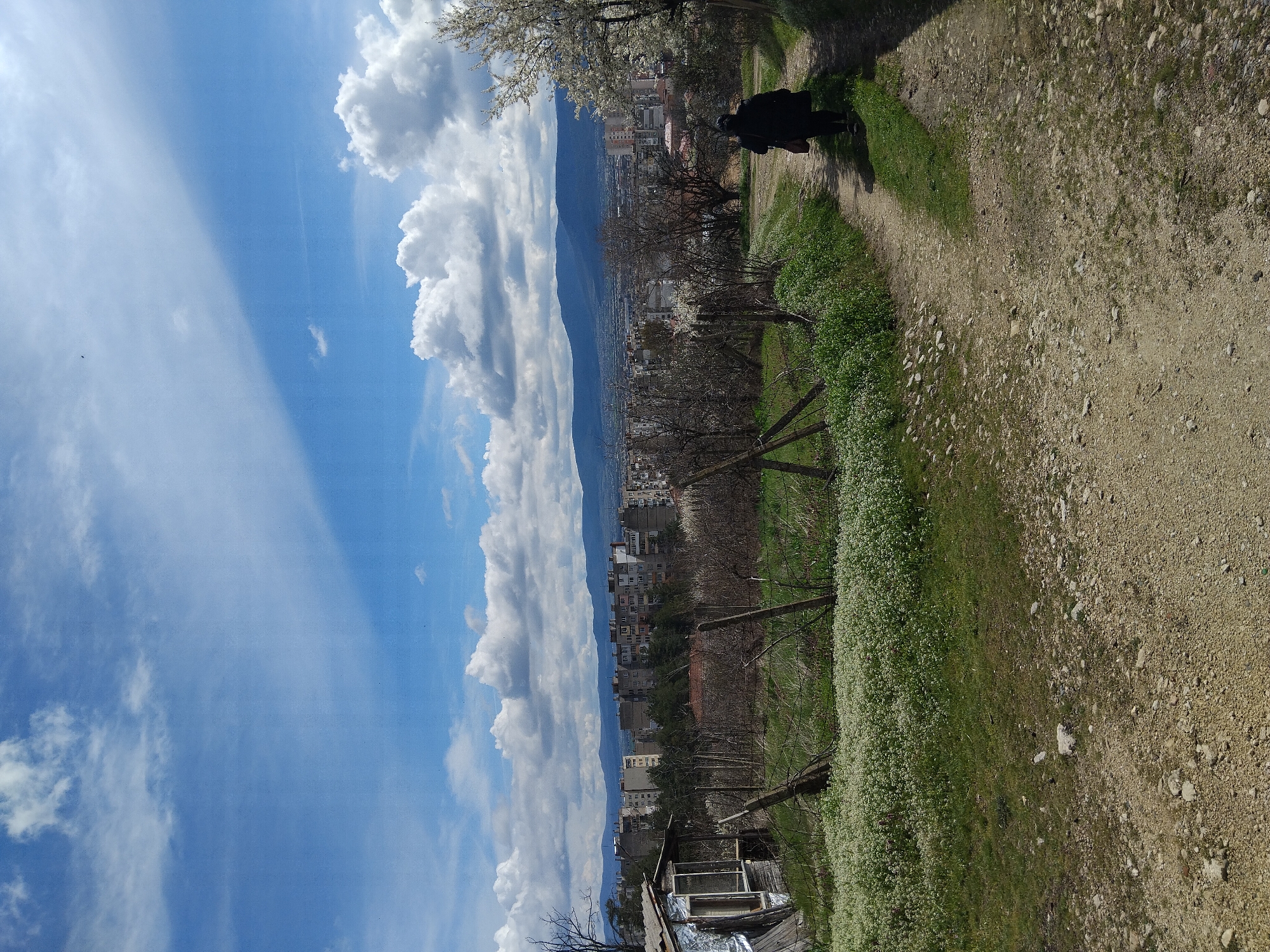 A landscape-oriented photograph captures a scene in Kazanlak, Bulgaria, featuring a dirt path in the foreground leading to the urban cityscape and mountains in the background. A person, dressed in dark clothing, walks along the right side of the path, their shadow visible in the sunlight. The path is lined with green grass and small white flowers, partially obscured by a broken wooden fence. The middle ground contains houses, trees, and other foliage within the city, while the background showcases a mountain range beneath a partly cloudy sky. The sky is predominantly blue with large, fluffy white clouds on the left. There are remnants of an old, dilapidated structure on the lower left side of the frame.