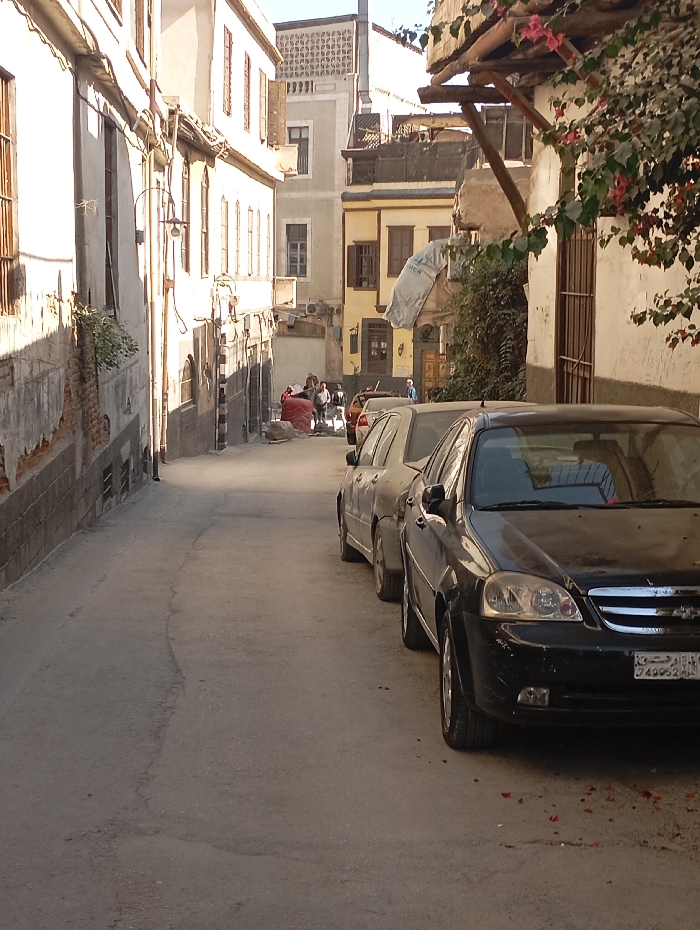 The image displays a narrow, paved residential alleyway in Damascus, Syria