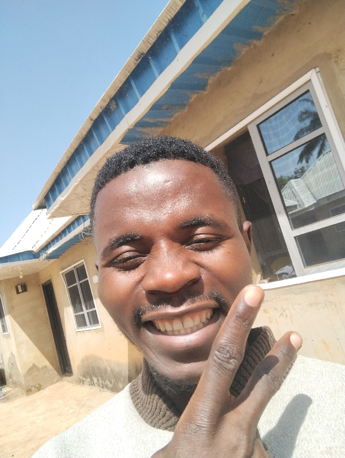 A dark-skinned male subject, approximately 20-35 years old, with short dark hair, a mustache, and a short beard, is prominently featured in a close-up, selfie-style photograph taken in the city of Kaninkon, Nigeria