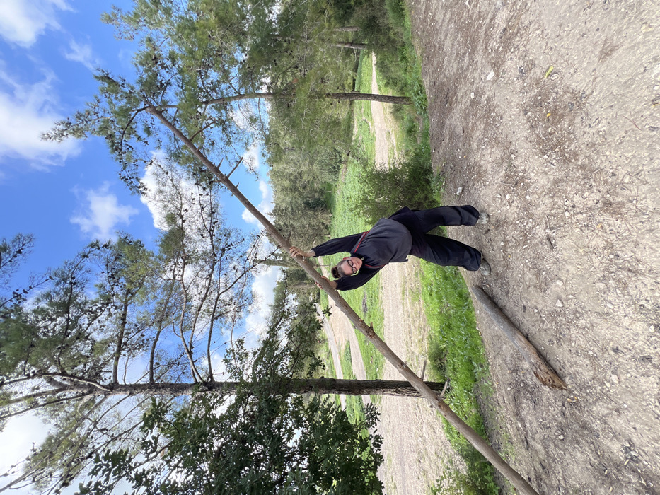 The image displays an outdoor scene within the Megido Regional Council, Israel, under a blue sky with scattered white clouds. A single individual, appearing to be an adult female with dark hair pulled back and wearing glasses, is centrally positioned. She is dressed in a dark long-sleeved top, dark loose-fitting pants, and light-colored shoes, with a red strap visible across her chest and right shoulder. The individual holds a long, unbranched, light brown tree limb horizontally above her head with both hands, appearing to lift or support its weight. The limb extends diagonally across the frame from the lower left out of view to the upper right, partially obscured by foliage. On the light brown dirt ground in front of her feet, a shorter, broken tree trunk or large branch lies horizontally. The foreground consists of dirt paths with patches of green grass and scattered pine needles. Numerous pine trees with dark green needles and visible cones populate the midground and background, alongside other green foliage, indicating a wooded or forest environment. The terrain appears uneven, with a slight downward slope from the viewer's perspective towards the left.