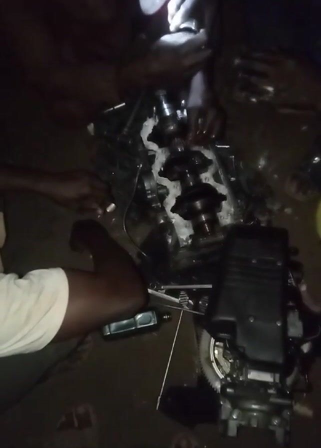 In a low-lit, dimly lit setting, possibly an outdoor space, at least two individuals are working on a disassembled internal combustion engine. One person, seen wearing a white shirt, is partially visible in the left of the frame, while another is primarily focusing on the engine components. A bright white light from a flashlight illuminates the central area, emphasizing the engine block and related parts such as the crankshaft and various tools scattered around on the ground. A black engine cover is also visible nearby. The individuals appear to be engaged in the process of repairing or reassembling the engine. The ground surface is uneven, showing signs of wear.