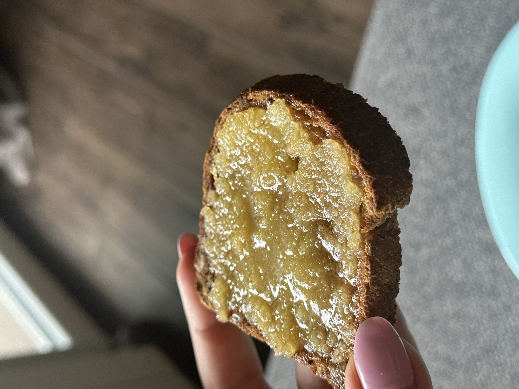 A hand with pink-varnished nails holds a slice of dark bread topped with a yellow, shimmering spread, likely honey or jam