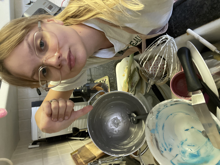 A domestic kitchen scene in Tel Aviv, Israel, features a young adult female and a substantial collection of dirty kitchenware. The female subject, with blonde hair, bangs, and clear-framed glasses, occupies the upper right of the frame, looking directly at the camera with a neutral expression. Her left hand is raised and positioned with the thumb pointing downward in a "thumbs down" gesture. This gesture is directed towards a dense cluster of unwashed cooking and baking items filling the foreground and midground. Prominent among these items are a large stainless steel mixing bowl containing white residue and a black spatula, a white plastic bowl with significant blue residue, and a wire whisk coated in white cream. Various other dirty plates, knives, and smaller bowls are haphazardly stacked within what appears to be a sink or on an adjacent dark countertop. In the background, a silver kitchen appliance and a black blender base are visible on the countertop against a light-tiled wall. The scene indicates the aftermath of a baking or cooking activity.
