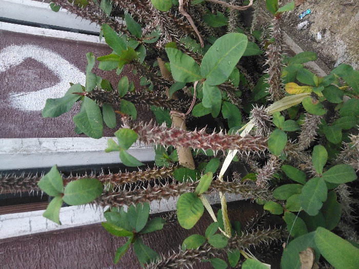 - "A detailed vertical image depicts a cluster of thorny plants, consistent with the *Euphorbia milii* species (Crown of Thorns), located in Ciherang, Indonesia" by FM-1kJrA2, licensed under CC BY 4.0