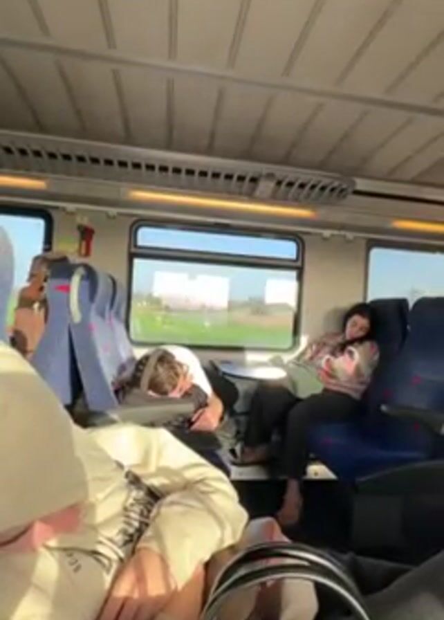 The interior of a train car is shown, in medium shot, with passengers seated. Three passengers are visible, but only one, in the foreground and wearing a light colored hooded jacket, is clearly visible. The passenger appears to be using a mobile device. Two passengers in the middle ground are sleeping. A landscape is visible through the window. A black purse or bag sits in the foreground. The interior of the train car is lit with a bright natural light.