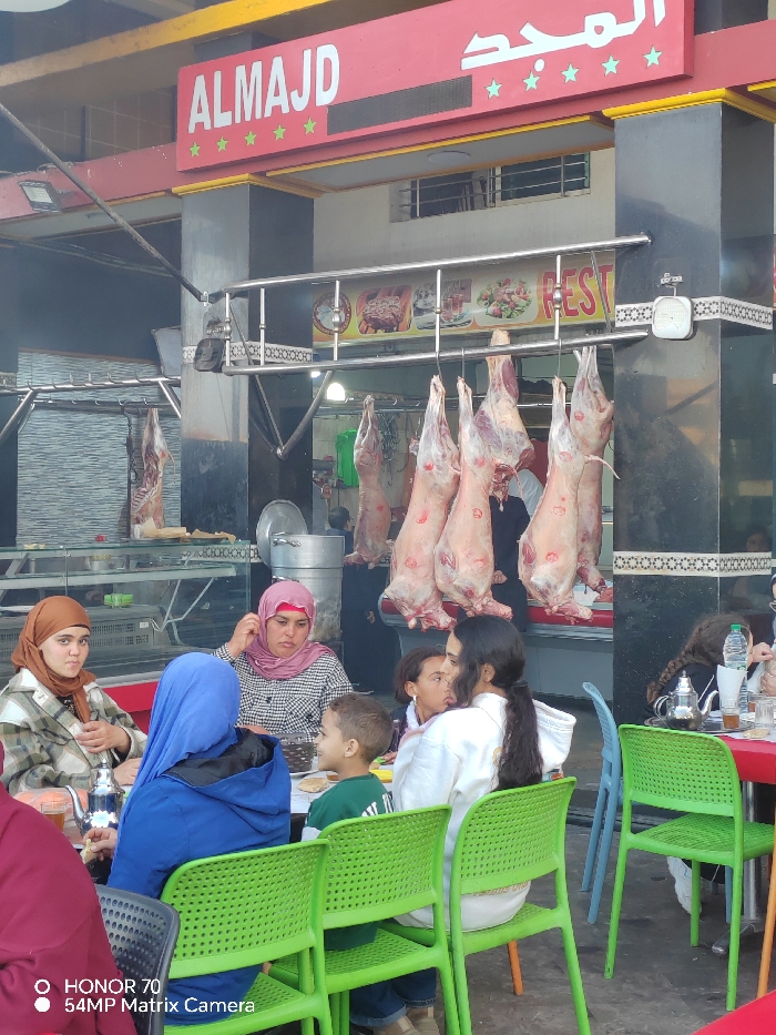 People are seated at outdoor tables in front of a restaurant named "ALMAJD." Four skinned animal carcasses hang behind the patrons. The restaurant's red awning features the name and stars. A glass case with food inside is visible to the left of the hanging carcasses. The tables are occupied by groups including women wearing hijabs and children. There are green plastic chairs around the tables, and a teapot is visible on one.