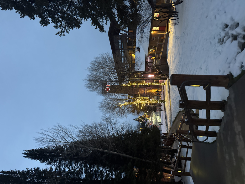 A twilight view showcases a snow-dusted scene. A tall clock tower with a red star at the top is centered, adorned with festive lights. Illuminated trees line the walkway. Adjacent buildings cast warm glows from their windows. A wooden railing frames the foreground, its lights subtly enhancing the scene. Evergreen trees stand tall at the bottom left. A building with dark brown roofing is on the top. The sky is overcast.