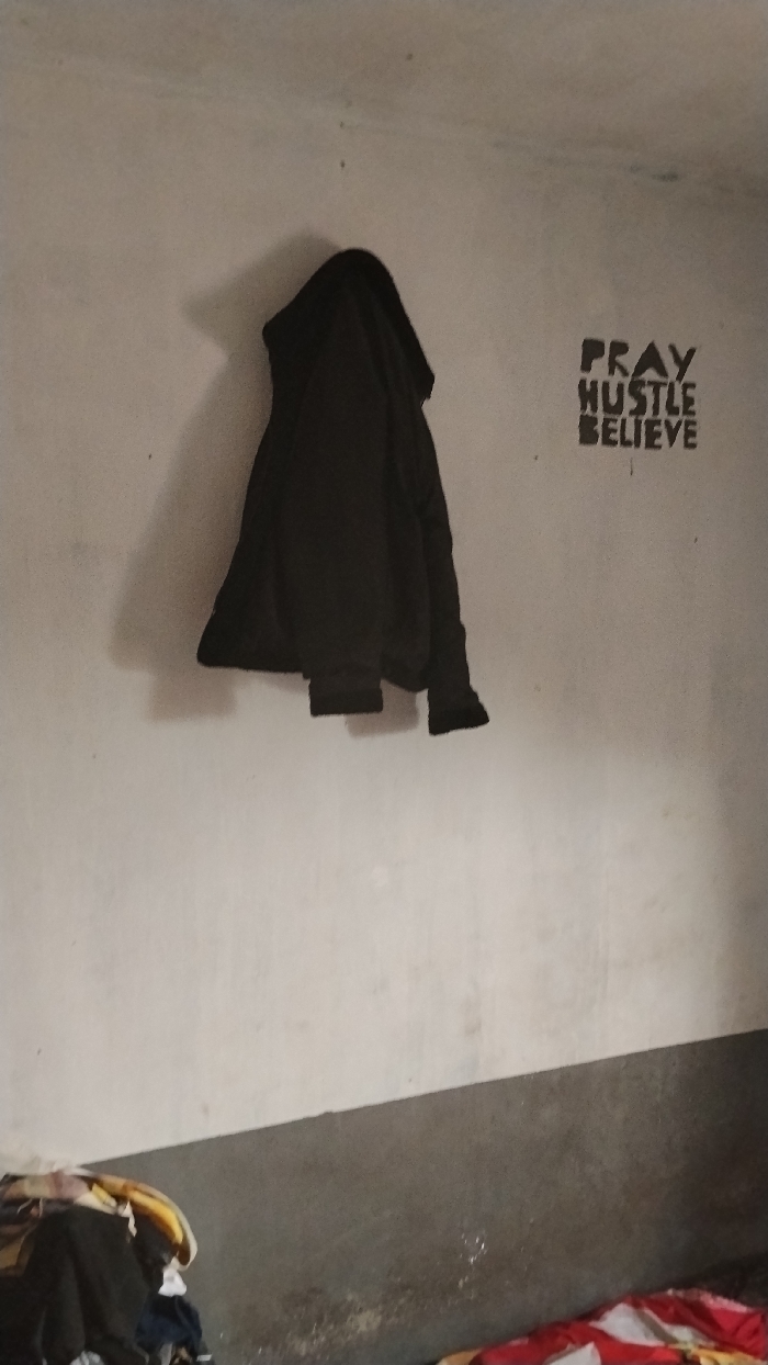 The image displays an interior room, location Unknown, Unknown. A dark, hooded jacket hangs on a light-colored wall in the upper left-center, casting a distinct shadow to its left. To the right of the jacket, stenciled in dark block letters, are the words "PRAY," "HUSTLE," and "BELIEVE," arranged vertically. The lower portion of the wall, approximately one-fifth from the bottom, is painted a solid dark gray, showing stains and wear. In the bottom-left foreground, a partially visible pile of folded garments or fabrics displays colors including yellow and dark tones. A section of red and white patterned fabric is visible in the bottom-right foreground. No individuals are present.