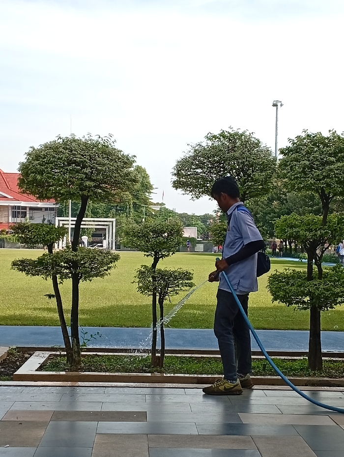 - "A man in a light blue shirt and dark pants is watering a row of small, sculpted trees with a blue hose" by FM-0ickv1, licensed under CC BY 4.0