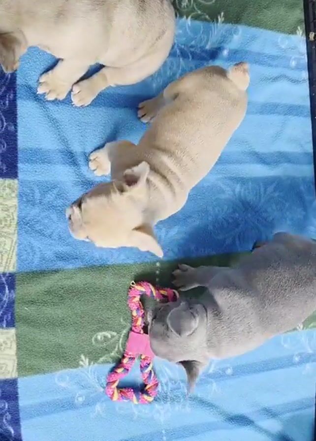 three French Bulldog puppies inside a wire crate. The crate is lined with a blue, green, and white blanket. One puppy is cream colored and sitting up. Another is cream colored and lying on its side, with its belly facing up. The third puppy is gray and chewing on a colorful toy. There is a small metal bowl in the corner of the crate. The camera is positioned directly above the puppies, looking down. The puppies seem playful and curious.