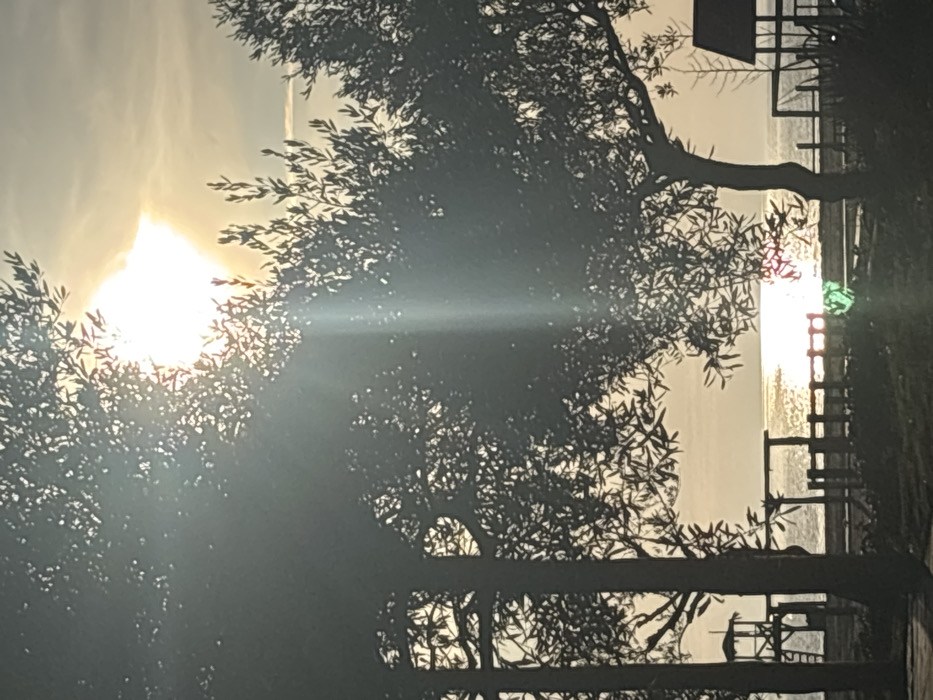 This image displays a coastal scene in Donji Štoj, Montenegro, captured during either sunrise or sunset. The sun, appearing as a brilliant white-yellow light source, is positioned in the upper center, partially obscured by the dark, dense foliage of several foreground trees, which appear to be olive trees. This strong backlighting creates a prominent lens flare, consisting of a vertical light streak extending downwards from the sun, and a faint green artifact near the water's reflection. The sky above is hazy and softly illuminated. A calm body of water, likely the sea, occupies the middle ground, showcasing a bright, horizontal reflection of the sun. In the far-left foreground, a two-tiered wooden lifeguard tower or elevated observation platform with a sloped roof is partially visible behind tree trunks. A low, dark, fence-like structure runs along the shoreline in the middle distance. On the far-right, a small, dark structure with a sloped roof stands near the water's edge, adjacent to a sparse, upright plant or young tree. No individuals or specific interactions are discernible within the frame.