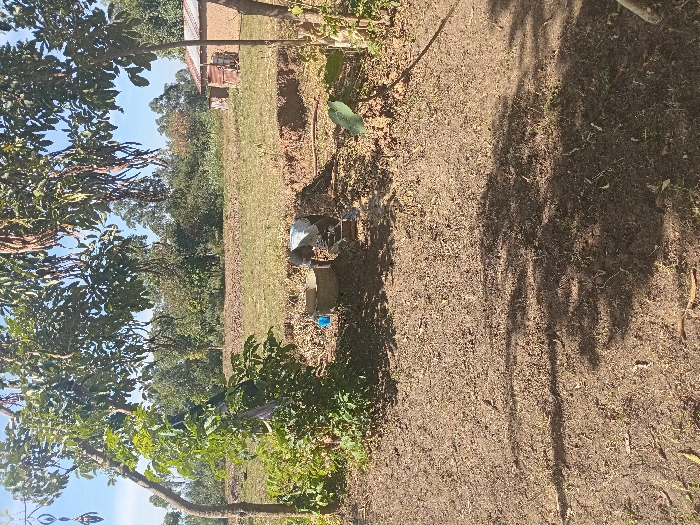 A rural landscape displays sparse vegetation and exposed dirt. A building rests in the background, nestled among trees. Foreground shadows partially obscure the terrain. A concrete structure with pipes sits prominently in the center, and miscellaneous items are scattered near it. Trees are visible on the left. The sky is light and clear.