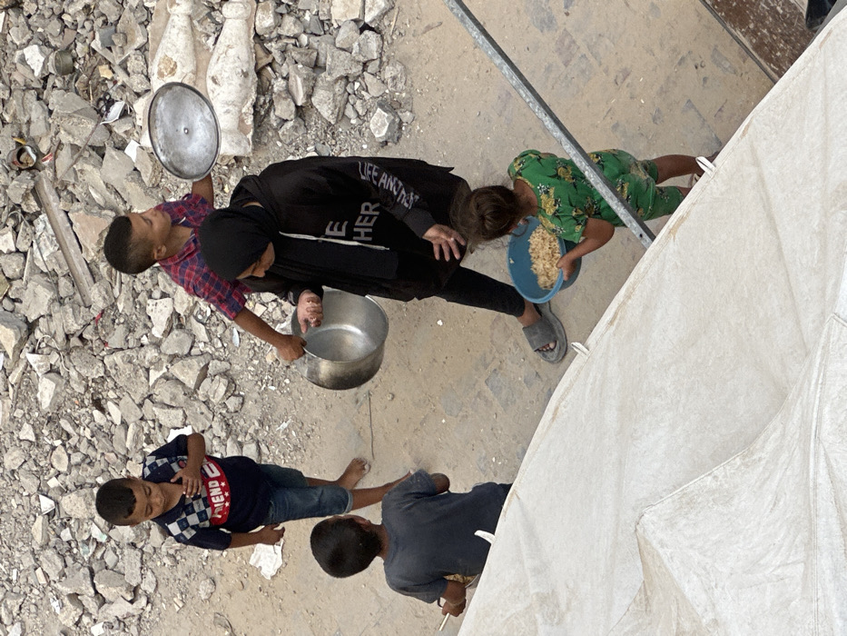 A high-angle photograph captures a scene of food distribution outdoors in Deir el-Balah, Palestinian Territory