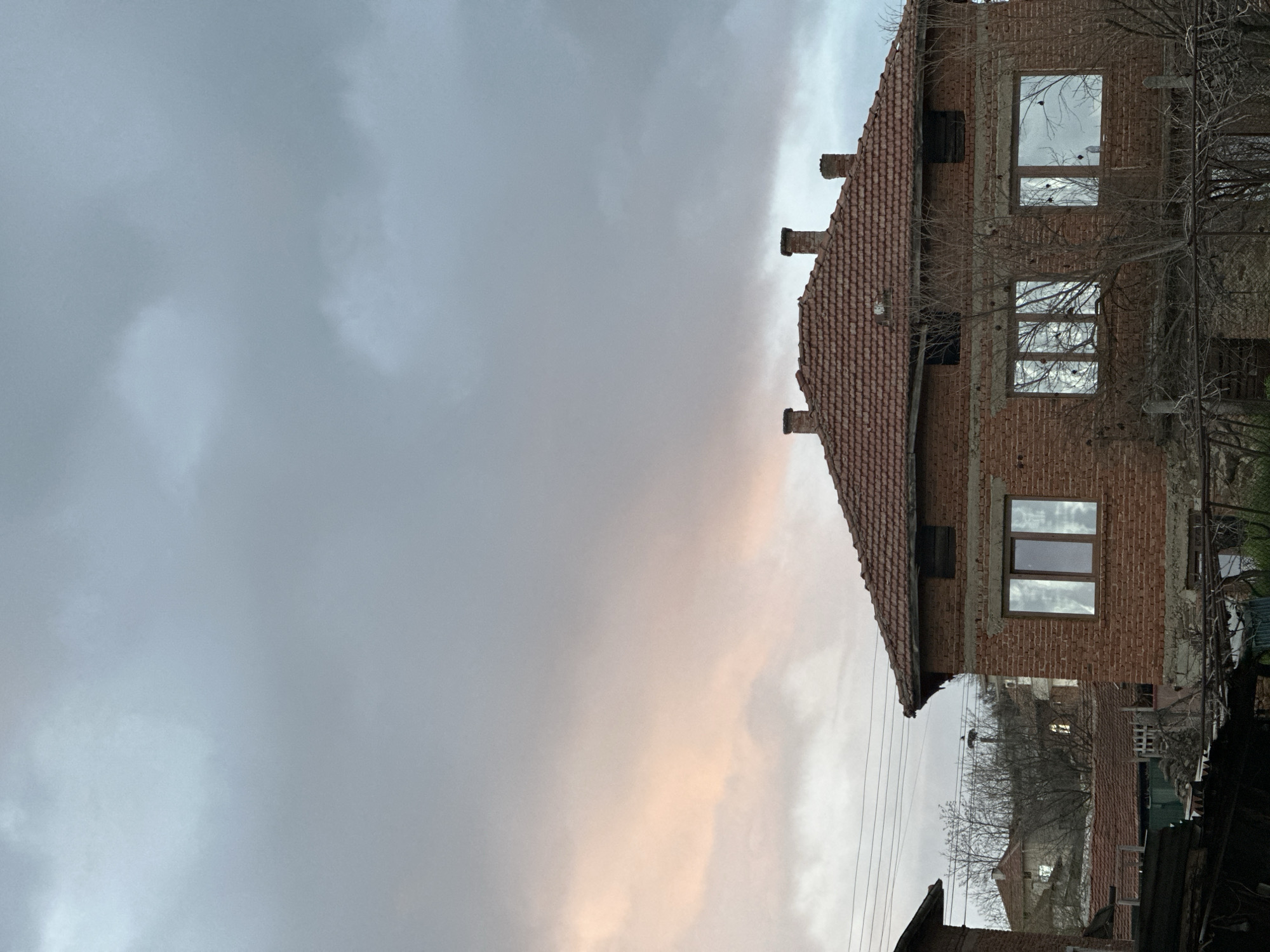 brick building with a terracotta tile roof in Karnalovo, Bulgaria. The building has three visible windows reflecting the cloudy sky. There are bare branches in front of the building and power lines visible in the foreground. The sky is overcast with hints of pink light. Other buildings can be seen in the distance.