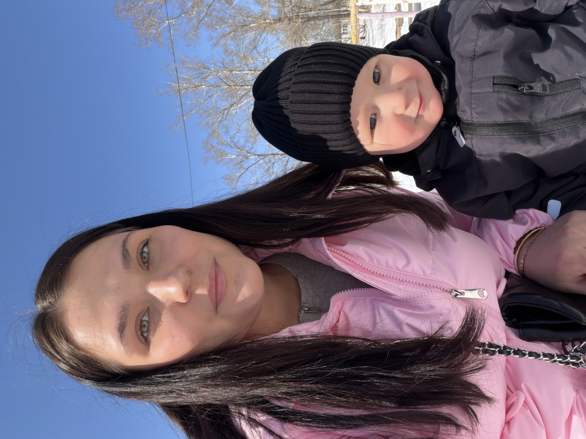 A selfie photograph shows a woman and a child in an outdoor setting. The woman is in the foreground wearing a pink winter jacket. She has long, dark hair and fair skin. Behind and partially above her is a young child wearing a black knit hat and a black winter jacket. The background shows a bright blue sky and bare trees, suggesting winter. Snow is also visible. There is no specific information in the image that indicates that this photograph was taken in the city of Chaikovsky, Russia.