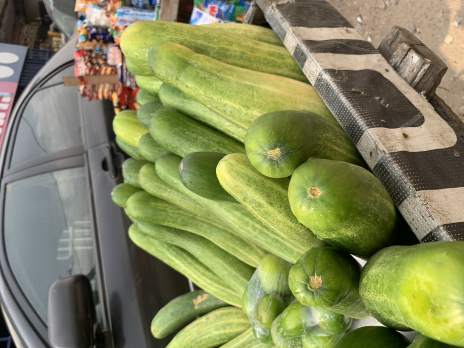 The image displays a street vendor's stall in Ikeja, Nigeria, primarily focused on a prominent display of cucumbers for sale