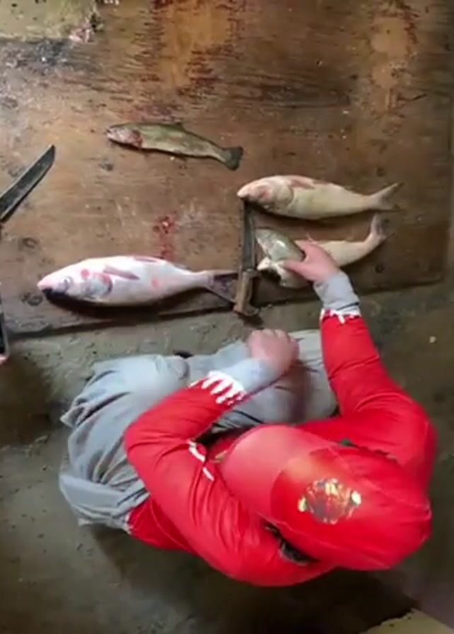 A man in a red long-sleeved shirt and a red cap is standing over a wooden table with five fish on it. He is holding one of the fish in his hands, examining it. A large knife is on the left side of the table, and another one is near the fish in his hands. A person is taking a video with their phone from the side. The environment appears to be a fish market or processing area.