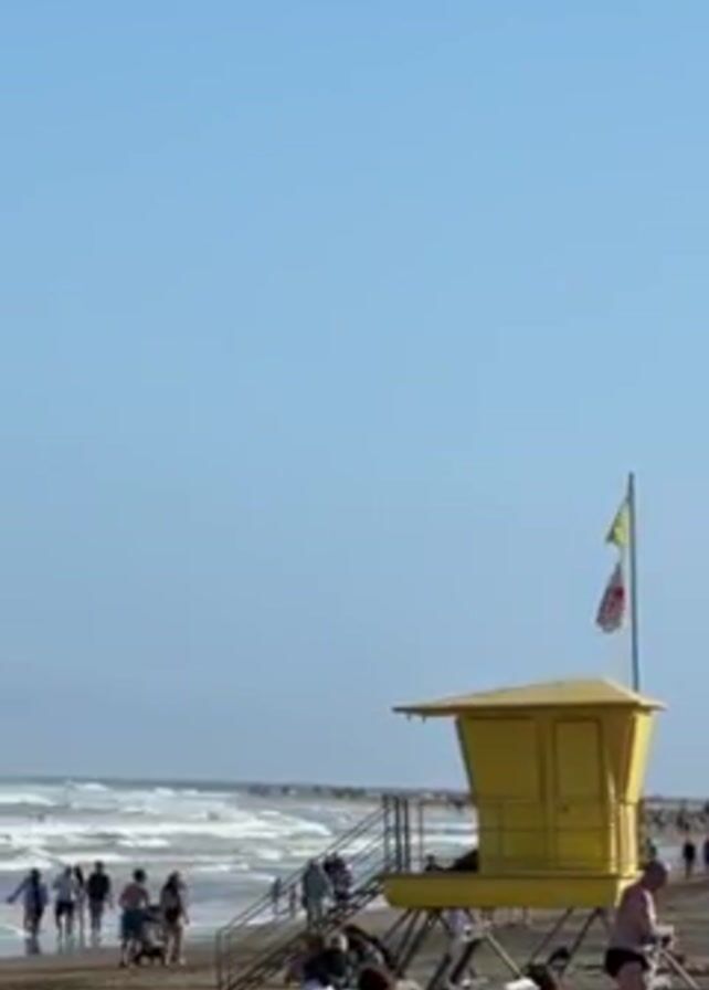 crowded beach on a clear day. There is a yellow lifeguard tower on the beach with a yellow flag and a flag with a red cross on it. People are walking along the shore and lounging on beach chairs. Waves are visible in the ocean.