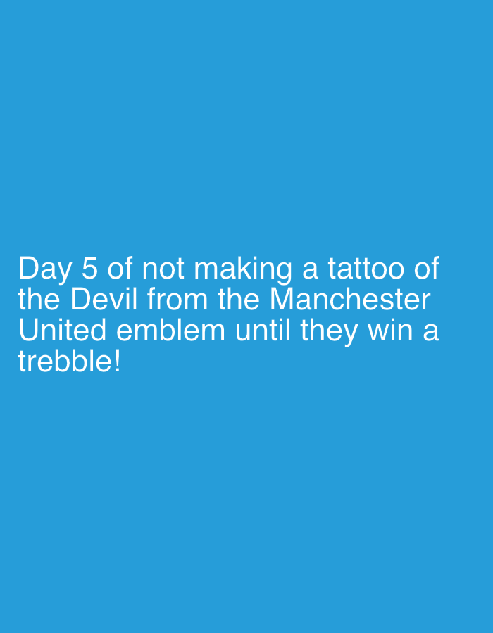 The scene is a digital display presented in Devin, Bulgaria. It features a solid, medium blue background. Prominently displayed in white, sans-serif typeface, the text reads: "Day 5 of not making a tattoo of the Devil from the Manchester United emblem until they win a treble!" No people, actions, or other discernible objects or interactions are depicted within the image frame.