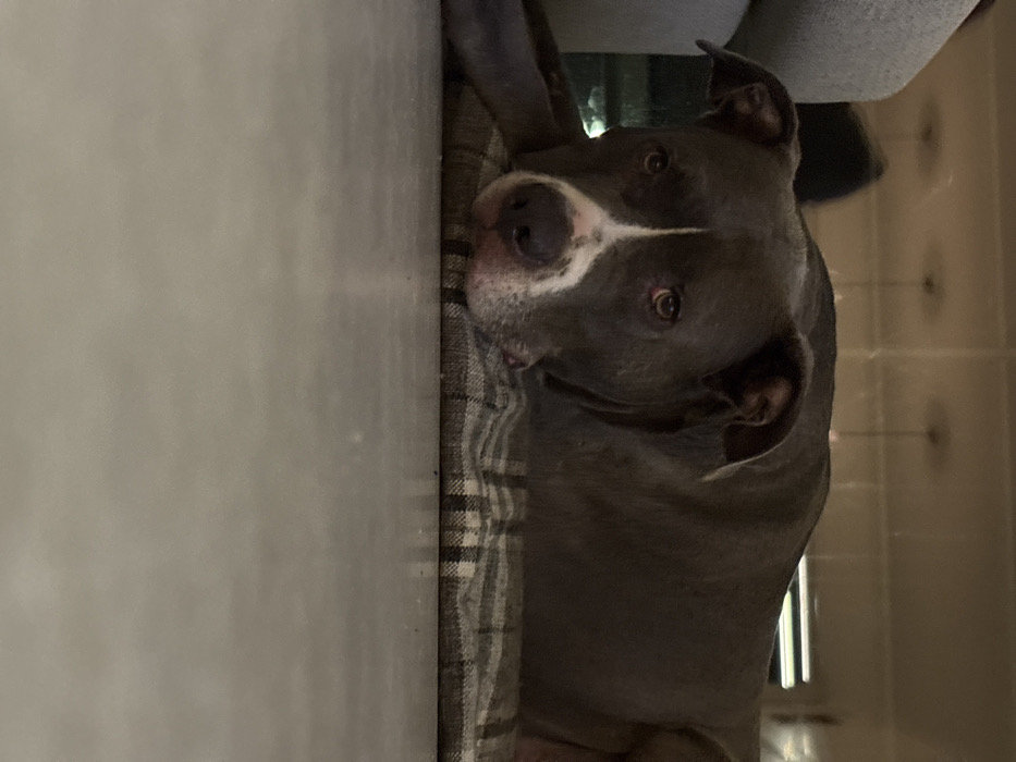 - "A gray and white pit bull dog lies sideways on a gray and black plaid blanket" by FM-ErVNw2, licensed under CC BY 4.0
