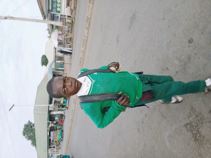 A young person in a green uniform, complete with a backpack, stands in the middle of a road. The person gazes directly at the viewer. In the background, there is a street with buildings, possibly shops or stores, visible along the roadside. The photo appears to be taken during daylight hours.