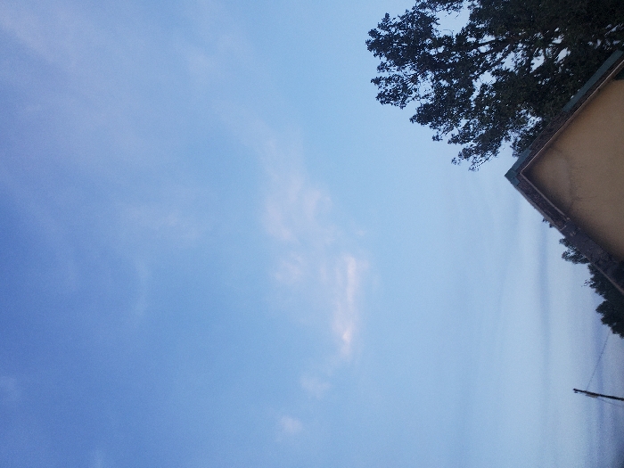 A sky of varied blue hues dominates the image, with soft, wispy clouds scattered across the left and center. A corner of a light-colored building and a mass of dark green tree foliage occupy the upper right. Along the bottom right, there is a hint of distant trees and a utility pole. The scene has a calm, natural ambiance.