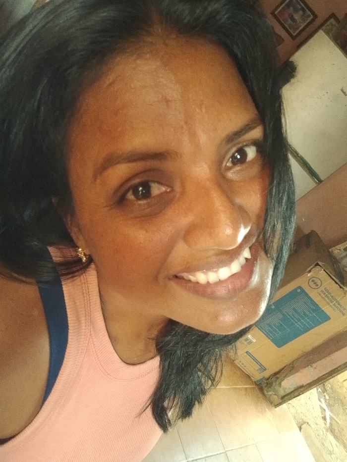 A woman with dark hair smiles at the camera. She has brown skin, dark eyes, and a bright, toothy grin. She wears a pink tank top with a blue strap showing underneath. The background is blurry, but a cardboard box labeled "Semi Automatic Washing Machine" and a picture frame can be seen. The image is taken from a slightly elevated angle, giving a slightly downward view of the woman.