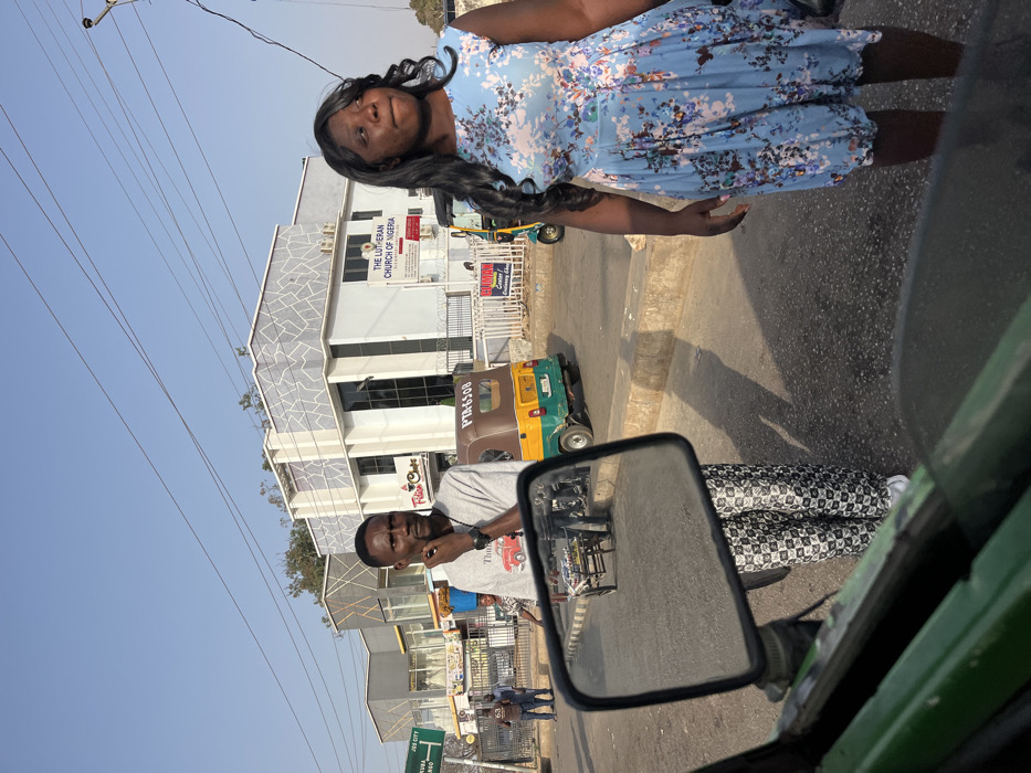 A woman in a blue floral dress is standing on a street, seemingly posing for a photo. Behind her is The Lutheran Church of Nigeria, a light-colored building with patterned stonework. In the foreground, a vehicle's side mirror reflects a man in a light-colored shirt. A three-wheeled vehicle, painted yellow and brown, is parked near the church. The overall scene is an outdoor urban environment with a clear sky.