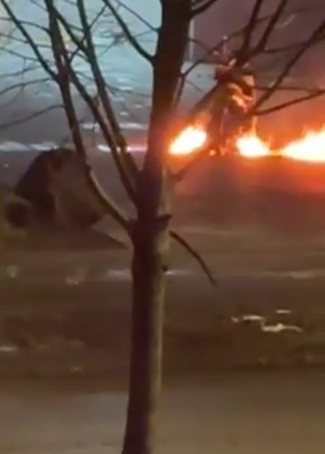fire burning on the ground in an urban setting, viewed from behind a bare tree