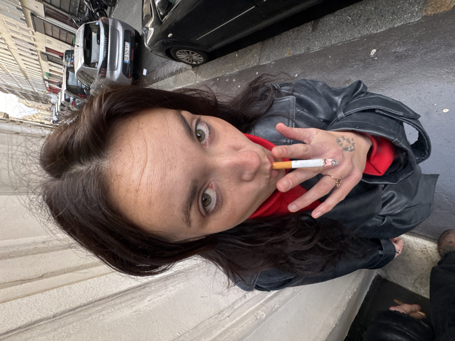 A woman takes a selfie outdoors, holding a lit cigarette to her lips. She wears a red turtleneck sweater and a black leather jacket. On her hand is a small tattoo and a gold ring. The street features buildings and parked cars.