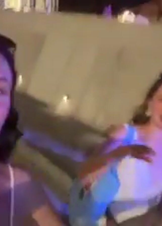 Two women are walking at night, with one woman holding the camera. The woman holding the camera is wearing a white top, and the woman next to her is wearing a blue and white top. The second woman is holding a white bucket and shaking it. The background shows a wall, street lights, and some trees. Other people pass by in the background. The camera is shaky and blurry.