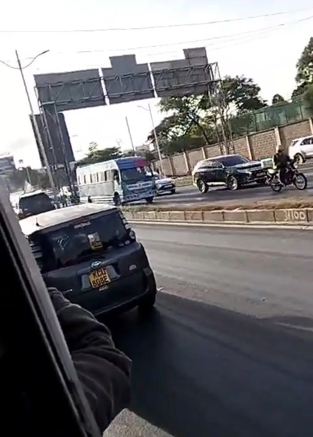 The view from inside a moving vehicle shows traffic on a busy road. A gray Toyota Passo is in front of the vehicle, and other cars, vans, and a small bus are also visible. The video shows the vehicles moving slowly, and a billboard and a few trees are visible on the side of the road. The sky is bright and clear. The arm of the videographer is visible in the lower left of the frame.
