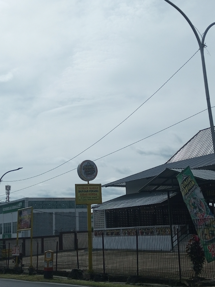 The image showcases a street scene in front of a restaurant. A yellow signpost bears the text "Rumah Makan Banjar Pinang Khas Sunda" along with smaller address details. Above the sign is a round logo. To the right, a banner displays "Rumah Makan Bakar Pinang." A building with a dark roof and awning is visible. A fence runs along the front of the property. Street lamps and utility lines are also present against a backdrop of a cloudy sky and a light-colored building in the distance.