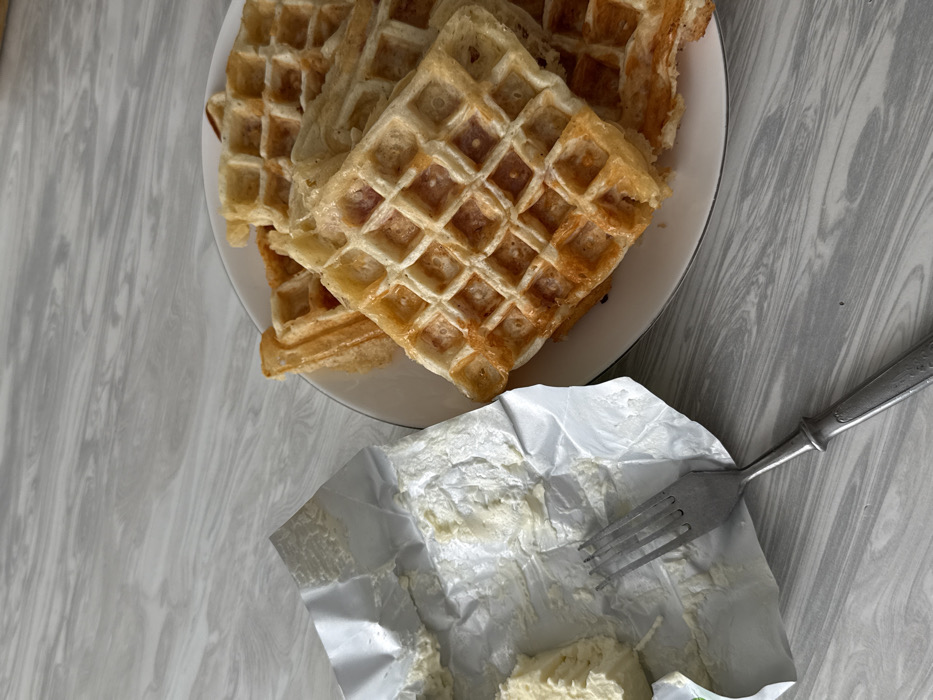 The image displays a close-up, overhead view of a prepared meal on a grey and white marbled surface, identified as being in Chaikovsky, Russia. On the right, a white round plate with a dark rim holds several golden-brown, rectangular waffles, stacked irregularly. Many waffles exhibit a slight sheen on their surfaces. To the left, a partially consumed stick of pale yellow butter rests within its crumpled silver foil wrapper. Indentations and residue on the butter and wrapper indicate recent use. A silver-colored metal fork, featuring an ornate handle design, lies diagonally on the surface, with its tines partially resting on the butter wrapper. No individuals are visible. The scene is brightly lit, suggesting an indoor setting.