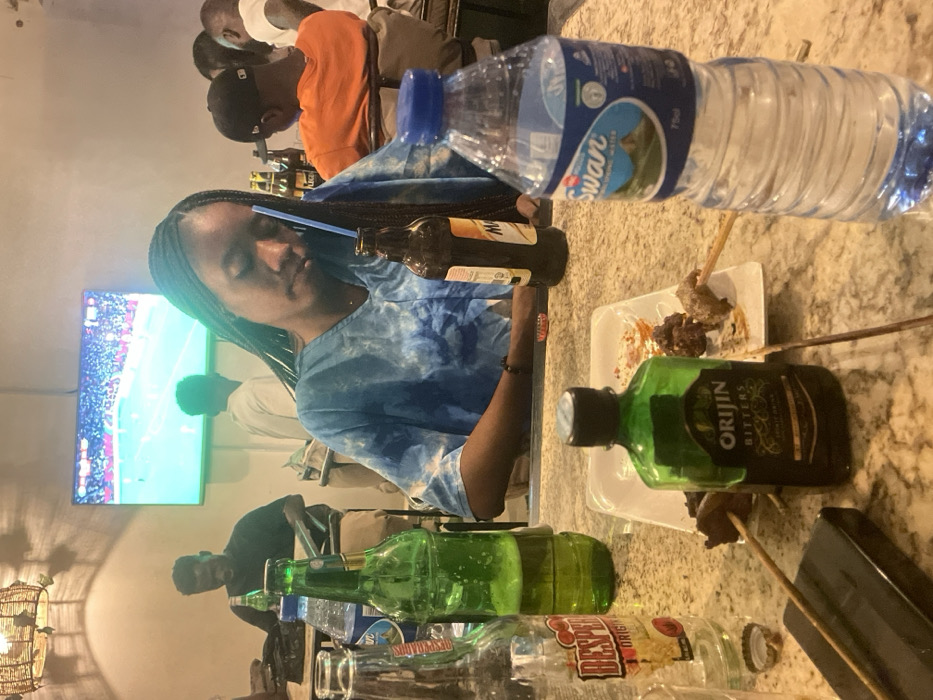 A gathering is captured in the image, focusing on a table setting. A woman with braided hair wearing a blue tie-dye shirt sits near a table cluttered with multiple bottles, including a green Orjiin Bitters bottle and a clear Swan water bottle. A plate of meat skewers is also on the table. A group of people and a television screen playing a soccer match are visible in the background.