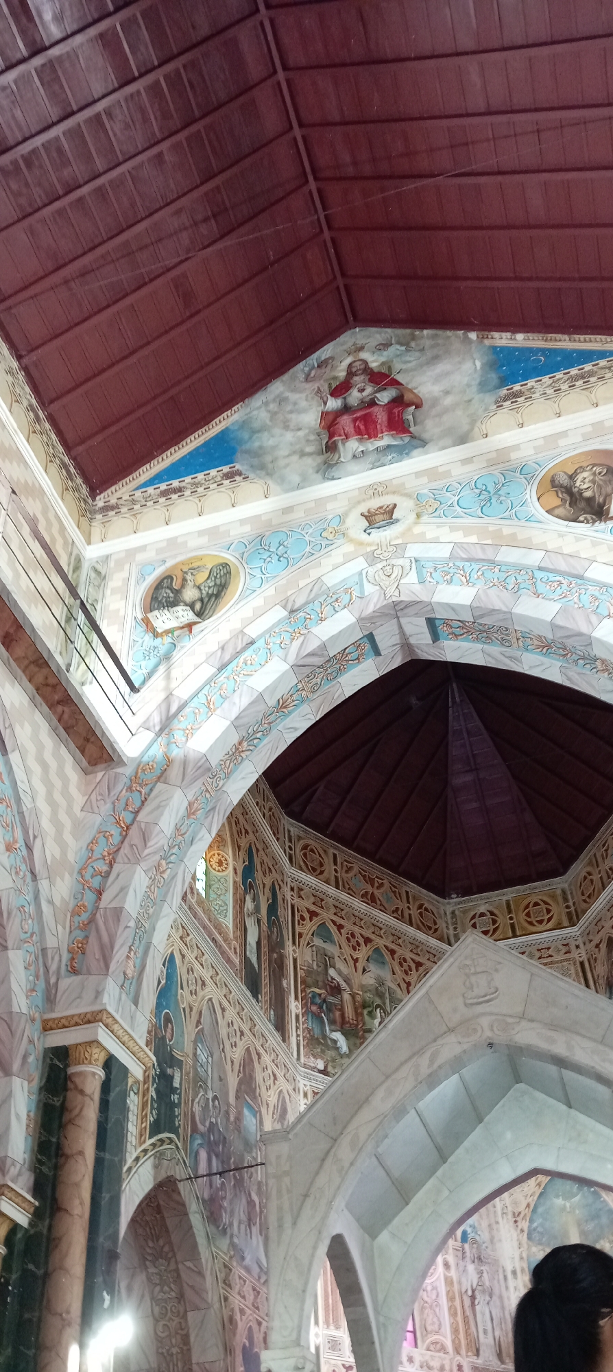 The image depicts the interior of a building, specifically a church, located in Tinaquillo, Venezuela. The architecture is characterized by high, vaulted ceilings made of red wood panels, adorned with religious paintings and decorative elements. The walls feature murals illustrating biblical scenes and portraits of religious figures. The arches are decorated with intricate patterns and floral motifs. At the top of the wall, are murals of Jesus Christ, a lion, an eagle and other religious symbols. The structure is supported by marble columns. The overall ambiance is one of religious significance and artistic grandeur.