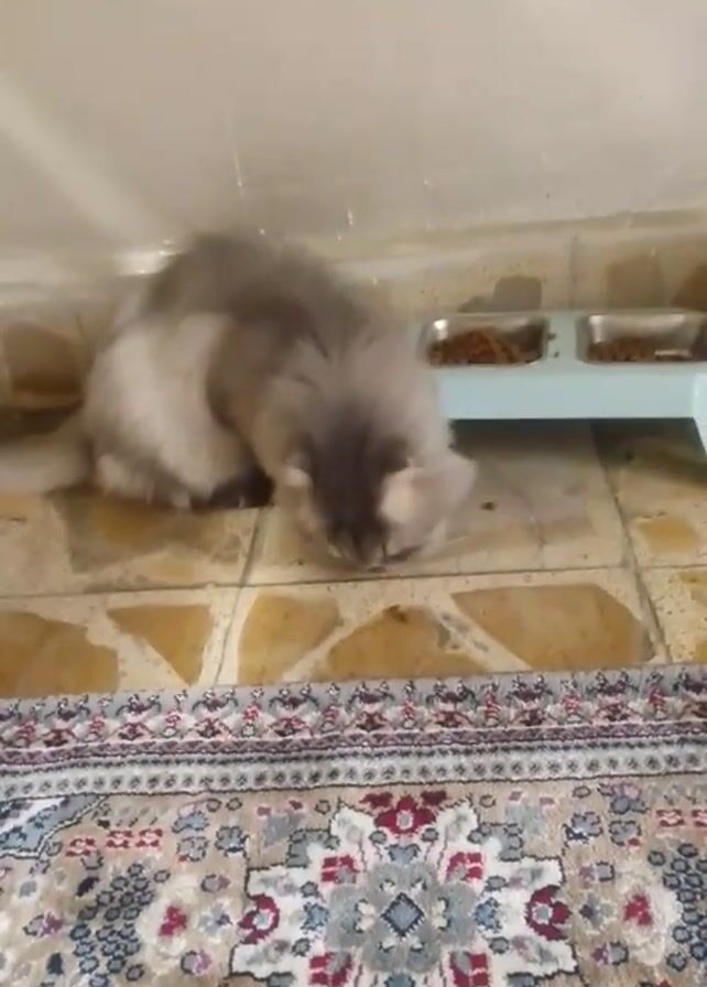 - "A gray and white long-haired cat is eating from a teal-colored cat food stand" by FM-o4pOG2, licensed under CC BY 4.0
