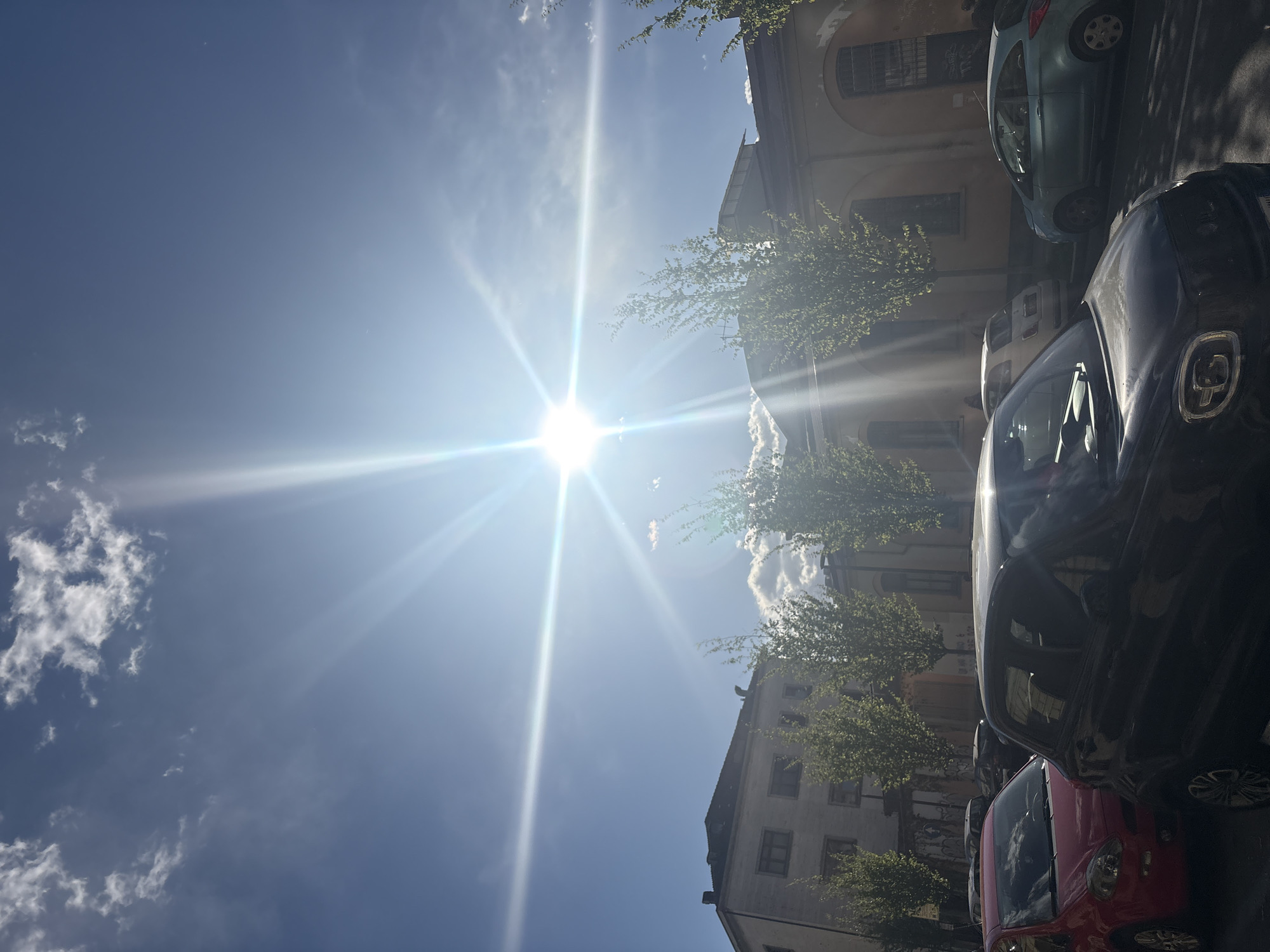The image depicts a sunny street scene in Turin, Italy. In the foreground, several cars are parked, including a red Fiat 500 and a dark-colored vehicle. Behind the cars, there is a building with windows and trees partially obscuring the facade. The sky is bright blue with some clouds, and the sun is shining intensely.